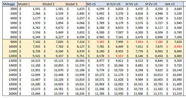 16/ I’ve color-coded each to show the point where you would be better off driving. For most of the models, the cross-over point is between 9k –12k miles. Hybrid, electric, sedan: car cost > rideshare cost up to 9k annual miles. SUV: car > rideshare up to 12k miles