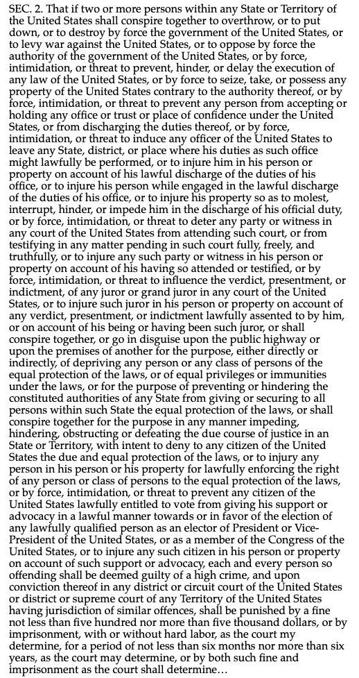 Ku Klux Klan Act of 1871, Sec. 2: "SEC. 2. That if two or more persons within any State or Territory of the United States shall conspire together ...." ".... to prevent any person from accepting or holding any office or trust or place of confidence under the United States ...."pic.twitter.com/YNFll8bP0J