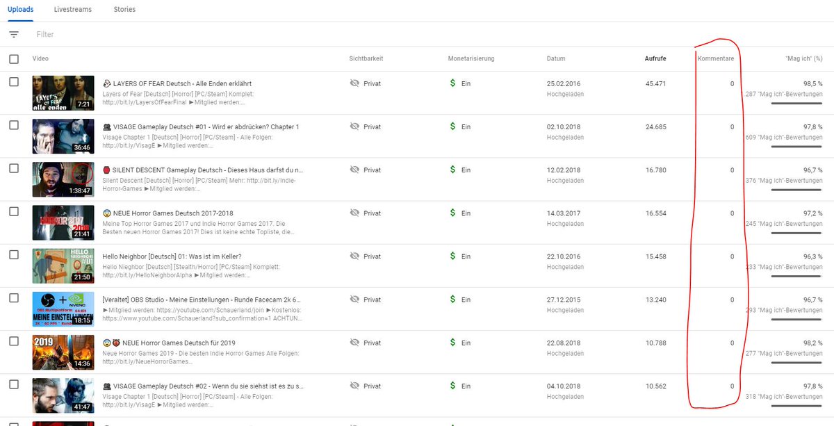 Und so siehts im Video Manager aus. Alle Videos "privat" alle Kommentare weg, aber likes sind noch da... zum Glück sind die videos noch dapic.twitter.com/6PoUehXNV7