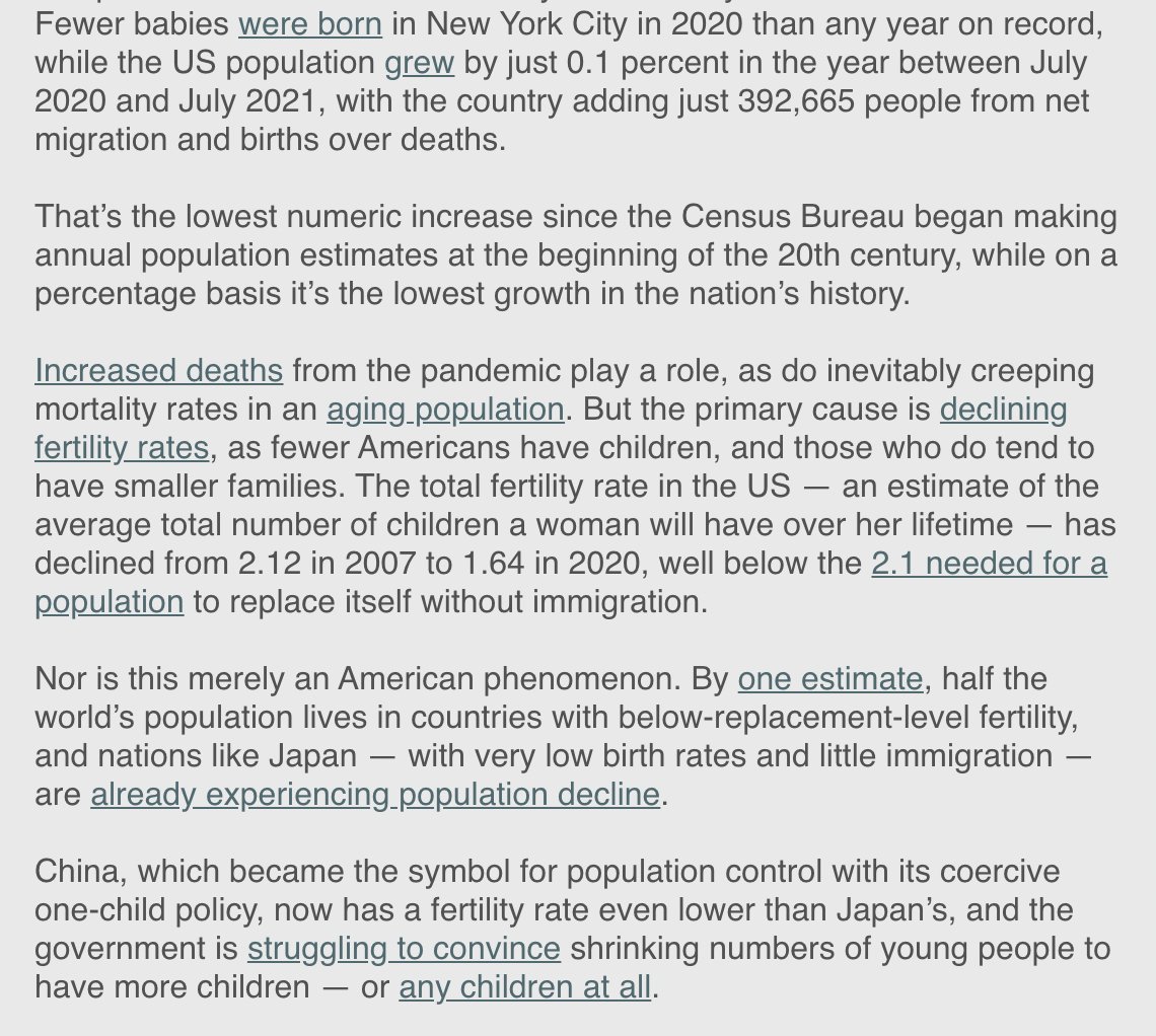 This seems like it deserves much more attention: - the total fertility rate in the US has declined from 2.12 in 2007 to 1.64 in 2020 - half the world’s population lives in countries with below-replacement-level fertility - China now has a fertility rate even lower than Japan’spic.twitter.com/CIbazSKue4