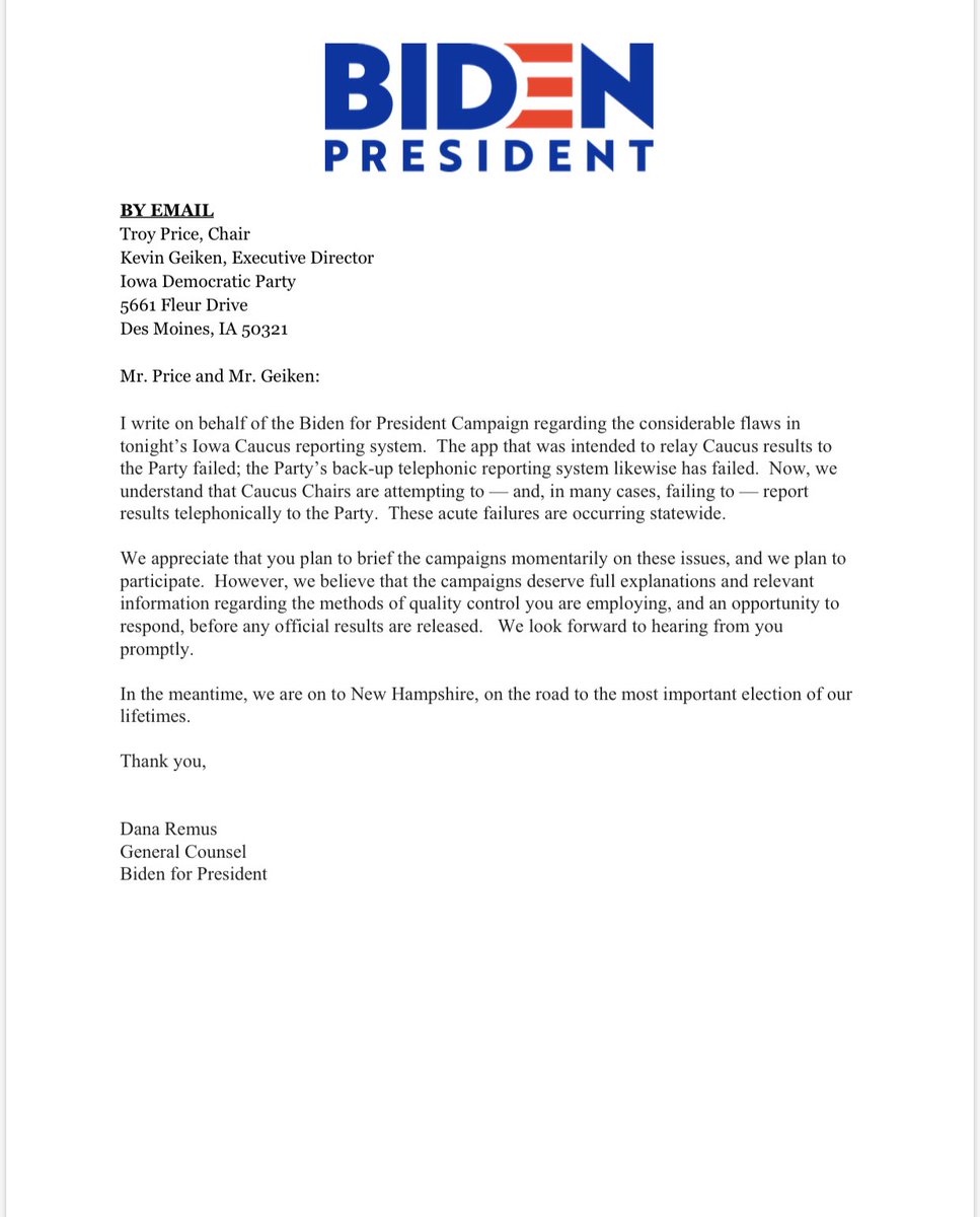 In letter to Iowa Democratic Party, Biden’s campaign asks for “full explanations and relevant information” on quality control methods — and an opportunity to respond — before results are released.pic.twitter.com/NuXivdZwhP