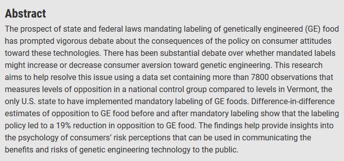 @ScienceAdvances finds that mandatory labeling may actually decrease opposition to genetically engineered foods: https://scim.ag/2KuWAS1 pic.twitter.com/cMmtiLIr2Y