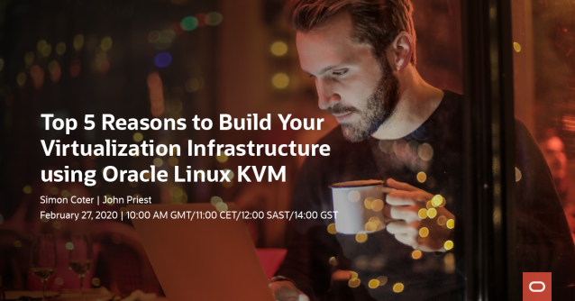 Register for this live webcast on Feb 27 to learn from Oracle experts, Simon Coter and John Priest, about the top 5 reasons to build your virtualization infrastructure using Oracle Linux KVM:
