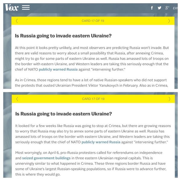 "Is Russia going to invade eastern Ukraine?" Looks like Vox's answer changed within the past hour pic.twitter.com/nJFBTZsIAx