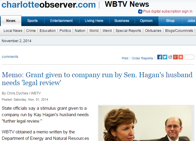 Charlotte Observer scrubs story re state legal review of Hagan stimulus self-dealing #ncsen