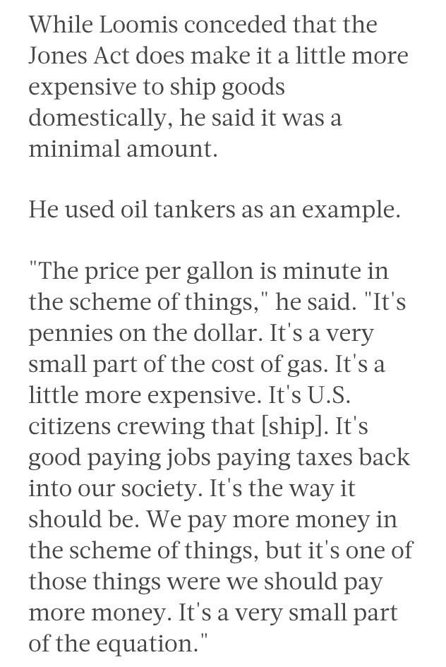 .@scottlincicome Jones Act costs $0.15/gallon of gas * 13B gallons/year = $1.95B...and that's just the cost to gasoline consumers!