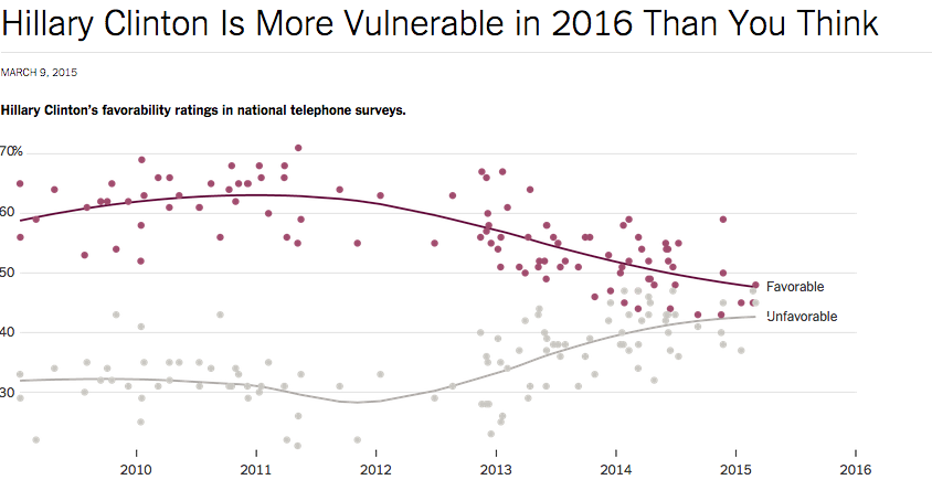 Hillary Clinton isn't looking like an especially strong general election candidate http://www.nytimes.com/2015/03/10/upshot/hillary-clinton-is-more-vulnerable-in-2016-than-you-think.html?hpw&rref=upshot&action=click&pgtype=Homepage&module=well-region&region=bottom-well&WT.nav=bottom-well&abt=0002&abg=0 … pic.twitter.com/xGdjczCaqh
