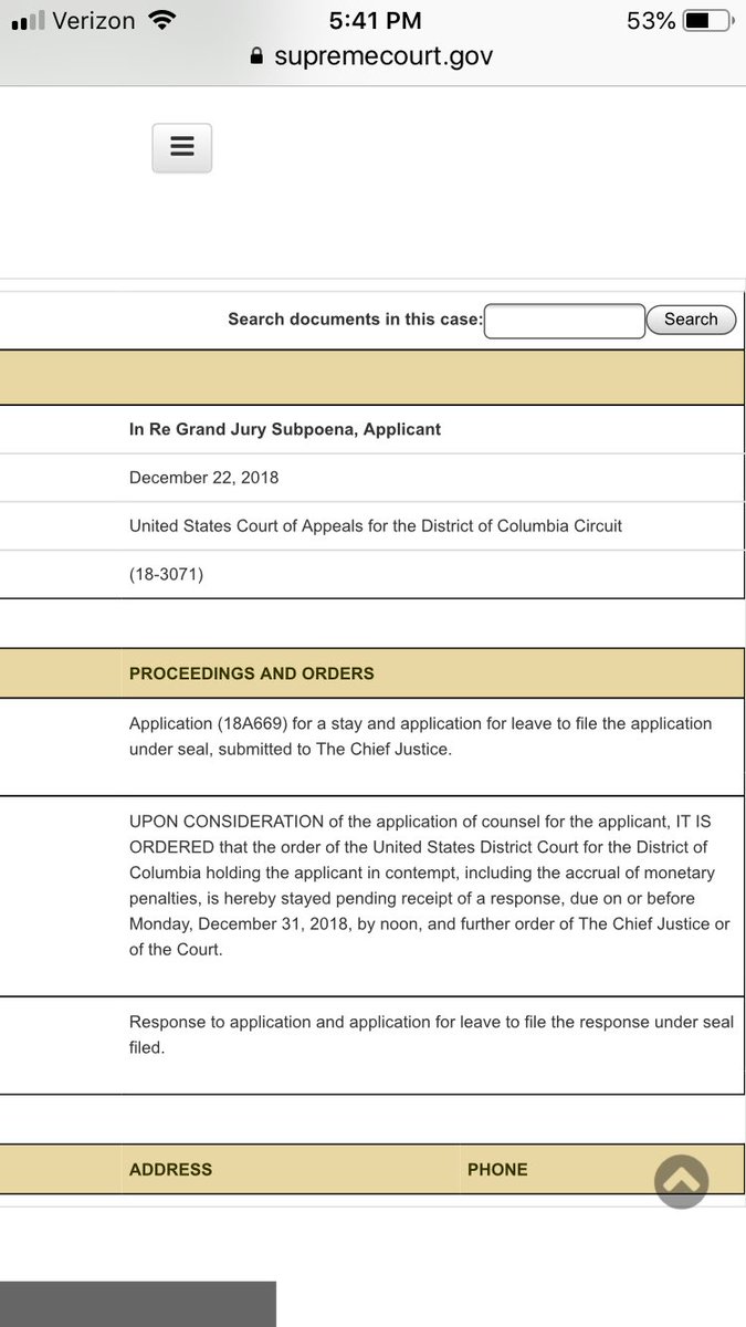 New: Chief Justice stays DC Circuit’s contempt order of mysterious foreign corporation until govt responds. Deadline Dec. 31. Case thought to involve Mueller investigationpic.twitter.com/4FeTrlpMFW