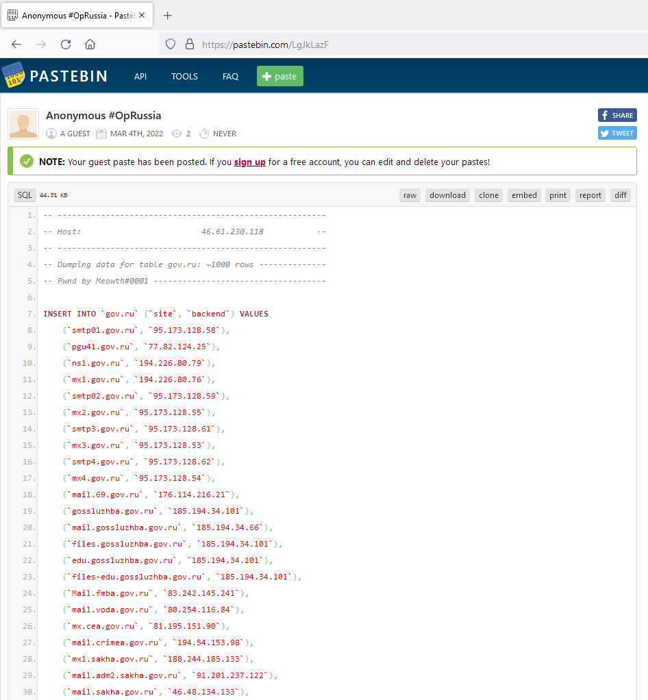 #Anonymous leaks database of the Russian Government website [http://gov.ru ]. The leak includes subdomains and backend ips for for every [http://gov.ru ] server. A sample of this breech can be found here: https://pastebin.com/LgJkLazF#OpRussia#FreeUkrainepic.twitter.com/3b8tlqb6up