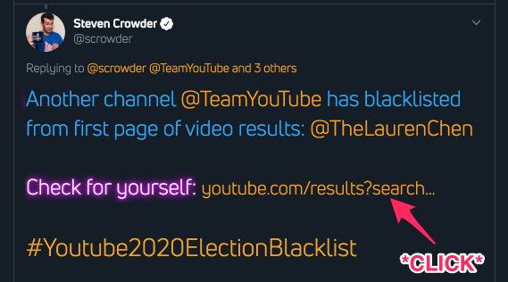 As we announced last night, @TeamYouTube has begun blacklisting right-leaning, conservative, and libertarian channels from the first page of video results leading up to the 2020 Election. Another channel affected: @PrisonPlanet https://www.youtube.com/results?search_query=Paul+Joseph+Watson&sp=EgIQAQ%253D%253D …pic.twitter.com/068LDcyrpT