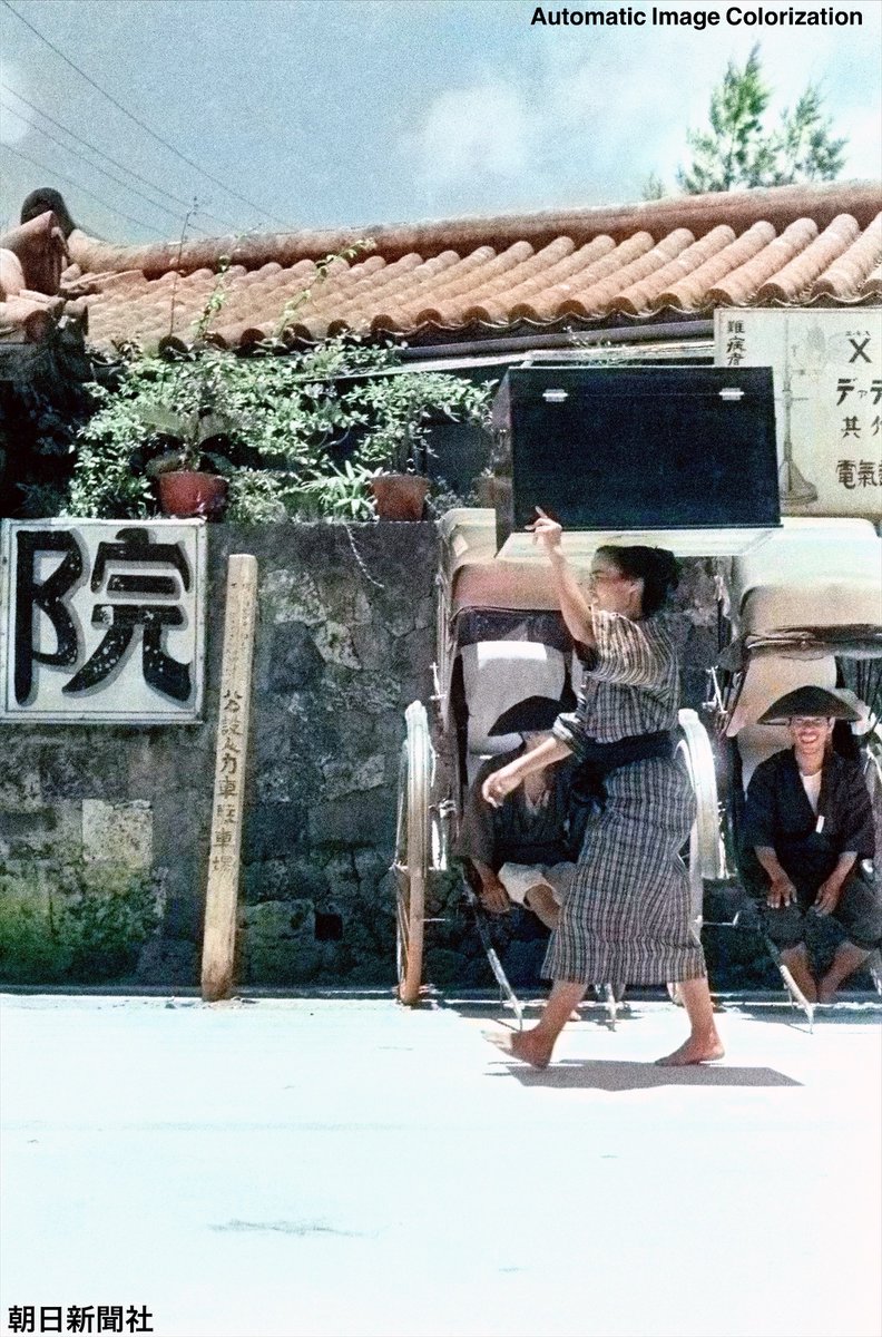 戦前の沖縄。1935年に那覇で撮影された,「ケー」と呼ばれる衣装箱を頭に載せて歩く女性。琉球王国時代から使われているものだが,この「ケー」では,デザインが本土風に変化している。背後には「公設人力車駐車場」と書かれている。ニューラルネットワークによる自動色付け+手動補正。pic.twitter.com/IFqjn11GxD