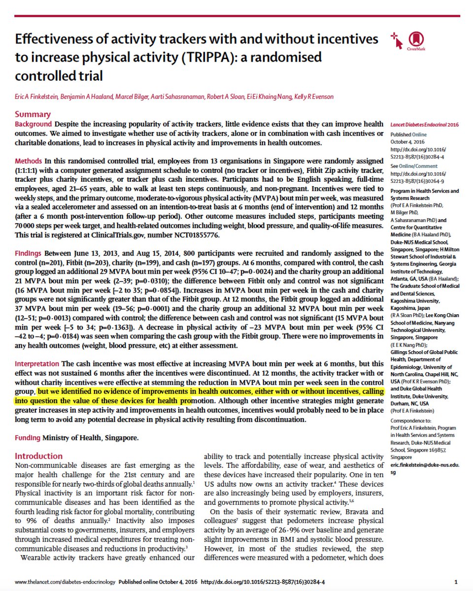 以 Fitbit 为研究对象,研究结果发表在柳叶刀的子刊上。评价几种方式对运动的鼓励作用,发现半年时金钱的刺激最有效,而 Fitbit 的刺激效果不明显。但到了一年以后,金钱刺激变得无效了,Fitbit 的刺激效果出现了。但整体而言,各种刺激方式都没能真正改变健康状态。https://twitter.com/EricTopol/status/783435330544218112 …
