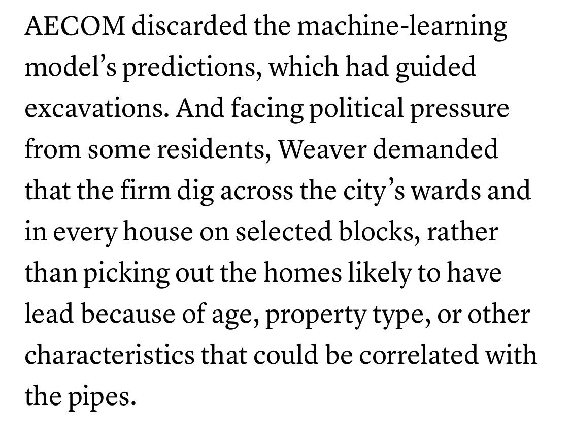 #civictech to predict which homes had lead pipes, achieving an 80% hit rate — but then the city stopped using the model & began systematically digging everywhere. It’s a cautionary tale & timely reminder of why leadership matters. https://www.theatlantic.com/technology/archive/2019/01/how-machine-learning-found-flints-lead-pipes/578692/ …pic.twitter.com/m6Rlb7G1Ni