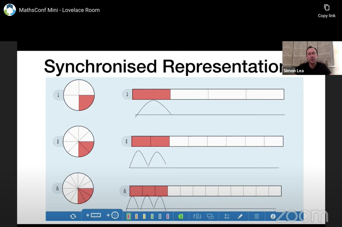 Simon Lea on the potential for dominating models to get in the way of understanding (i.e. geometic circles for fractions - made me think of the placement of the equals sign). I'm going to start synchronising representations regularly