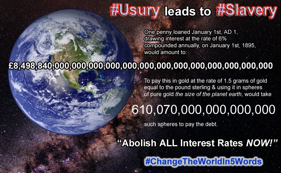 #Usury and the transfer of#wealth from the workers to the#Bankers we need a non-interest bearing currency. New money needs to be spent into existence without charging interest.#Government debt needs to be#banned!#FederalReservepic.twitter.com/VeFNFONKv1