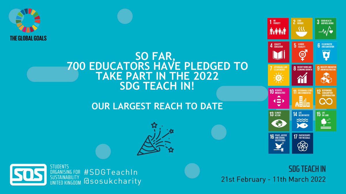 Wow! Over 700 educators have now pledged to take part in the 2022 SDG Teach In, the largest reach we've had to date! There's still time to pledge, check out the link: http://ow.ly/v2V050Iefr9