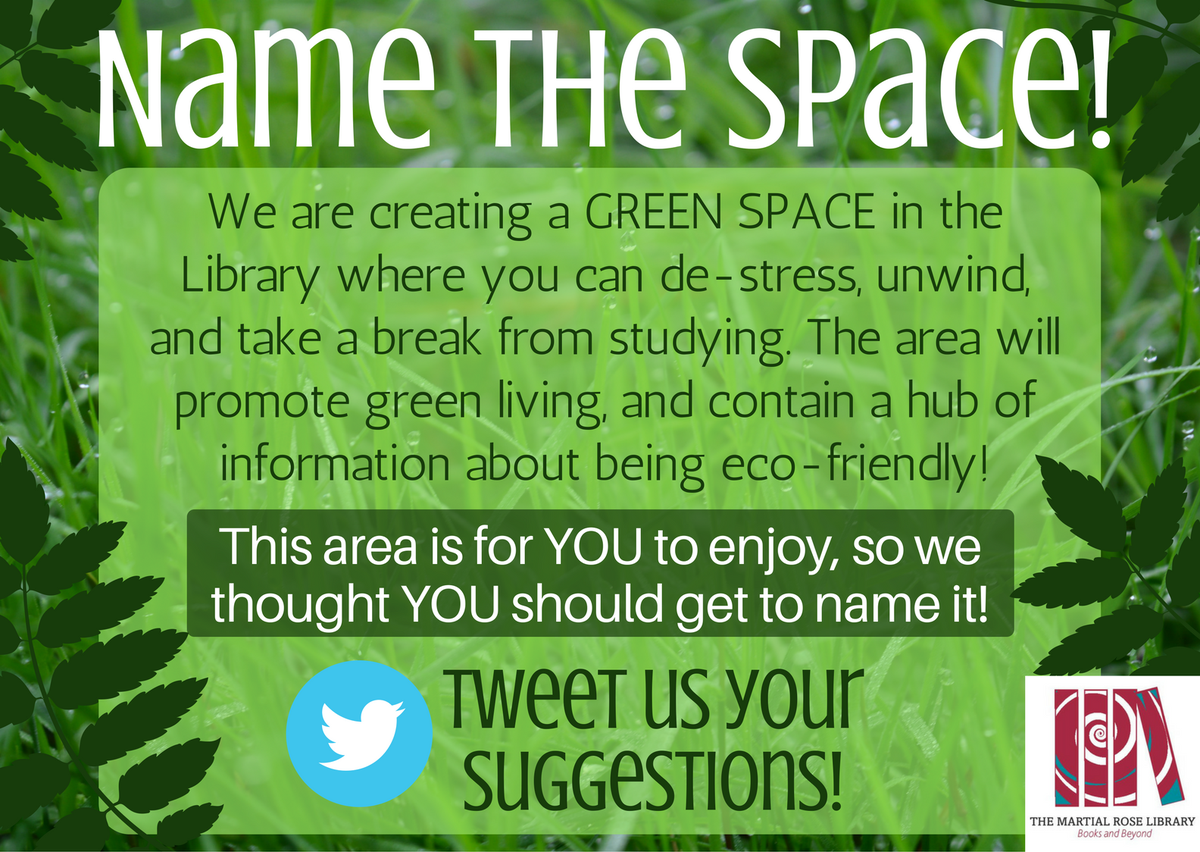 Only a few days left to submit your name suggestions for the new Library Green Space! We'd love to hear any ideas you have - tweet us your suggestions or visit our name suggestion box in the Library!