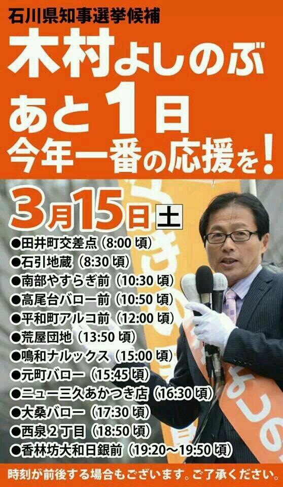 @yoshisapo: 3月1日・2日の木村よしのぶ石川県知事候補日程。街頭演説会と個人演説会のご紹介です。ぜひ拡散してくださいね~#石川県知事選#石川県#木村よしのぶ pic.twitter.com/Y1EcNkdvLC"