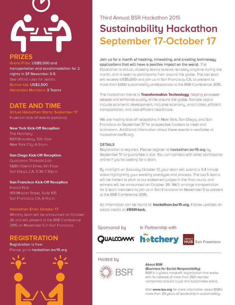 @BSRnews Sustainability#Hackathon kicks off Thursday. Are you joining us? http://bit.ly/1gpvPOz#BSRhack pic.twitter.com/VpwDv0N6Jm#BSR15