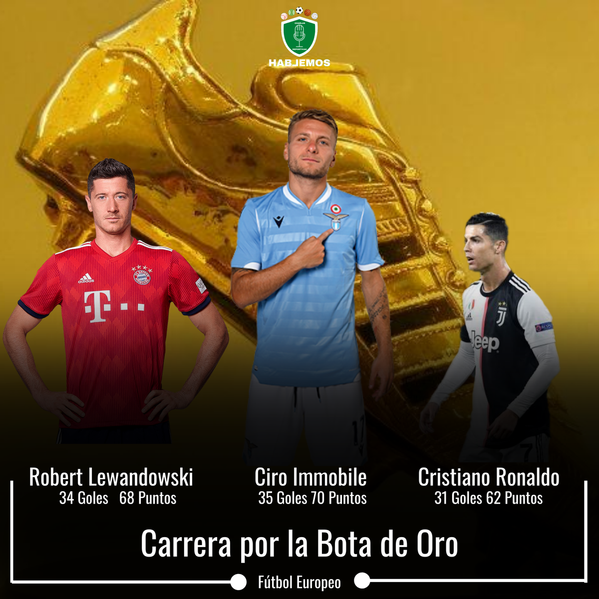 ACTUALIZACIÓN: BOTA DE ORO 2019/20: 1. Ciro Immobile (Lazio/Italia): 35 goles. 70 puntos. 2. Robert Lewandowski (Bayern Munich/Alemania): 34 goles. 68 puntos. 3. CR7 (Juventus/Italia): 31 goles. 62 puntos. 4. Timo Werner (RB Leipzig/Alemania): 28 goles. 56 puntos.