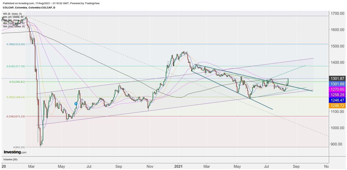 #Colcap cerrando en su MA 200 (+2.59%) es que lo haga en un día normal, con Acciones en US cayendo alrededor del 1% y Dólar subiendo a nivel global. La figura técnica muestra un cambio de tendencia, aún falta el volumen como para confirmar.. pic.twitter.com/OkxiKyoBhW