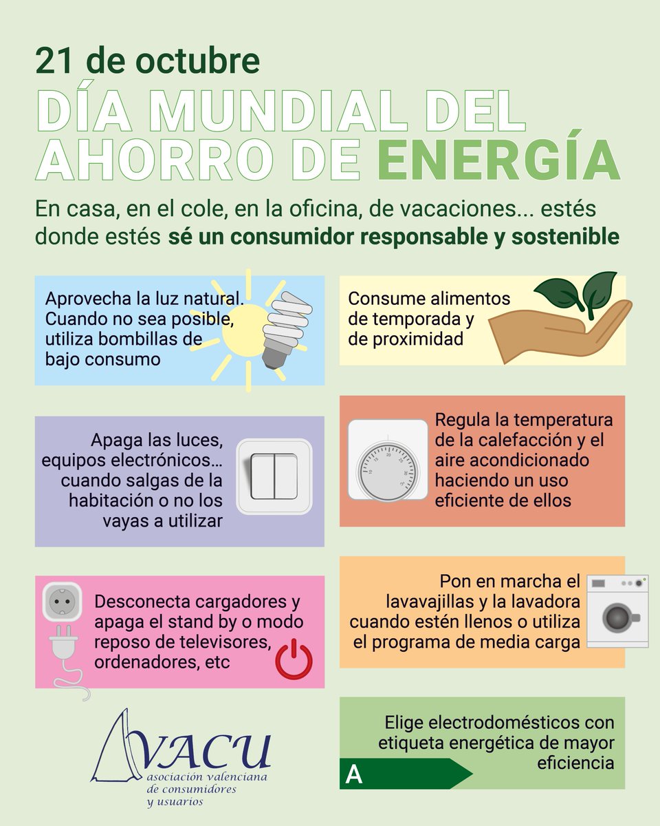 21 de octubre #DíaMundialdelAhorrodeEnergía#AhorroEnergético En casa, en el cole, en el trabajo, de vacaciones... estés donde estés, sé un#consumidor responsable y sostenible