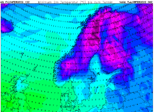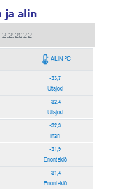 Perjantai 4.2.2022 Selkeä suoraviivainen kireä pitkä pakkasjakso jatkuu Suomessa. Laajalti -30C