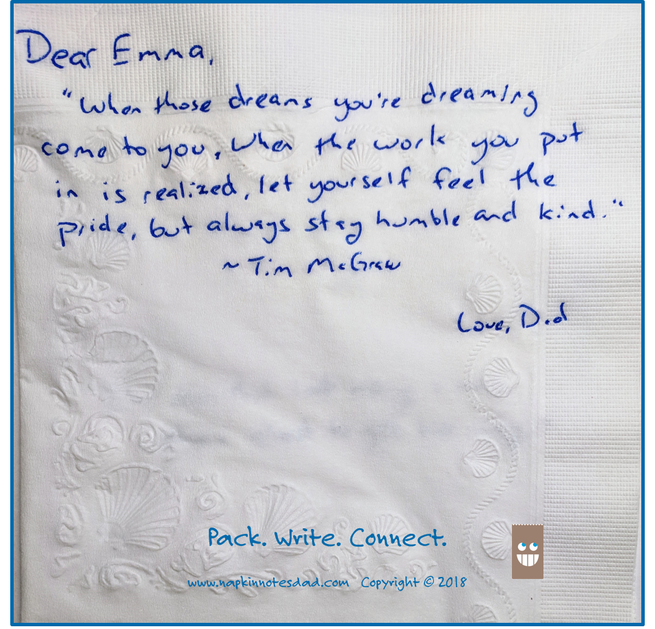 Dear Emma, "When those dreams you're dreamin' come to you When the work you put in is realized Let yourself feel the pride but Always stay humble and kind" ~Tim McGraw Love, Dad Pack. Write. Connect.