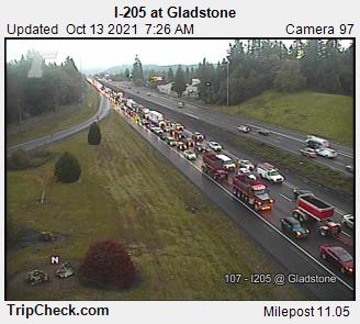 I-205 SB lined up through Gladstone down to the Abernethy Bridge. Earlier crash there has moved to shoulder. Now a new crash blocks the left lane on the NB side.