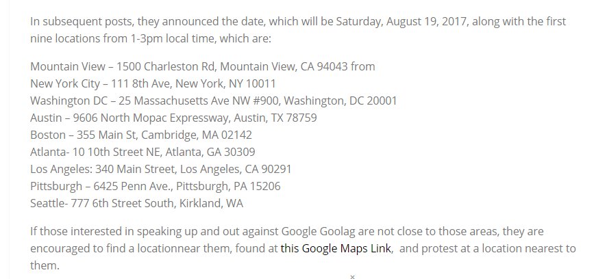 #MarchOnGoogle announced for Saturday, August 19th, across 9 U.S. cities http://bit.ly/2uAiawu -