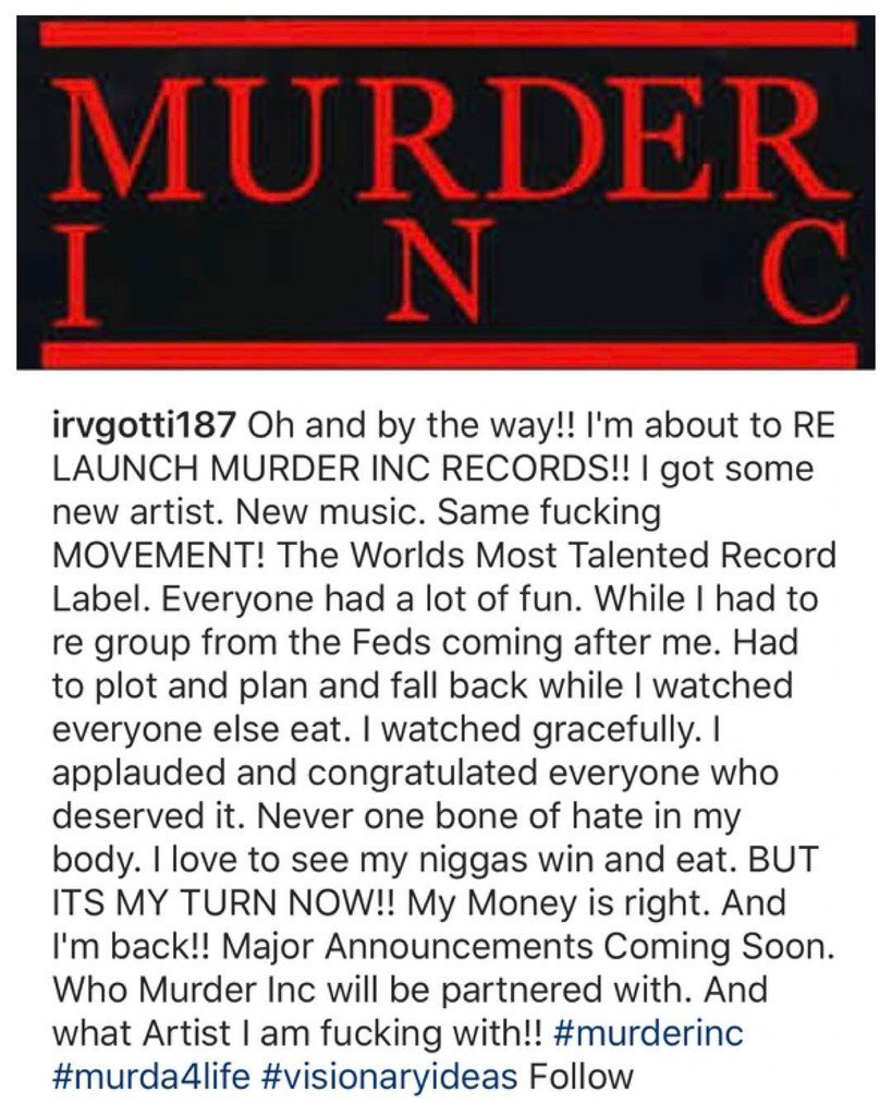 #IrvGotti says he's bringing back#MurderInc, "the world's most talented label". http://ift.tt/2pwTrWv pic.twitter.com/kvSbpQmE26