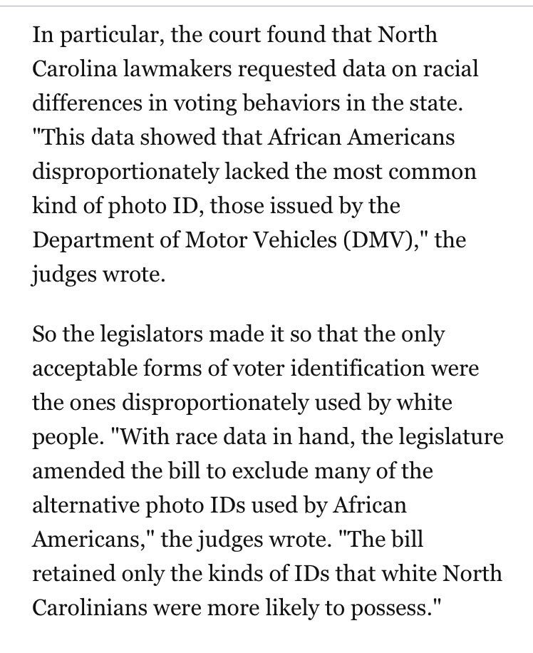 Racist Voter ID law in NC struck down! http://www.politico.com/story/2016/07/court-strikes-down-north-carolina-voter-id-law-226438 …