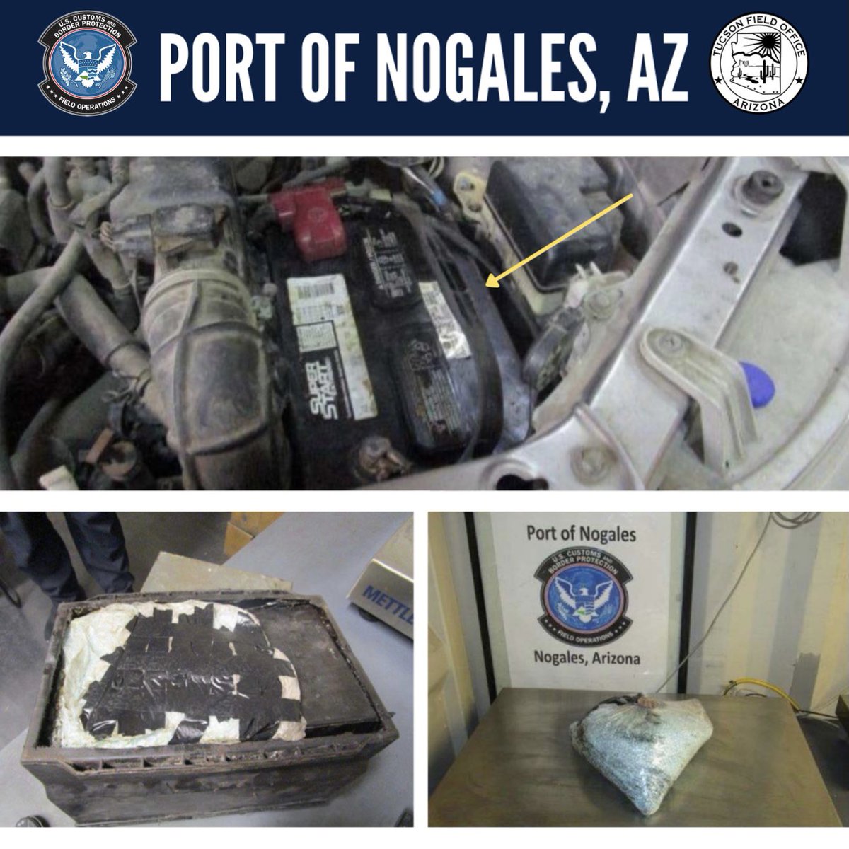 @CBP Officers at the Port of#Nogales arrested a 33-year-old female attempting to smuggle approximately 35,000 fentanyl tablets. The fentanyl was concealed within the battery of the vehicle- est. value $108K. Thank you#CBP Nogales Officers!