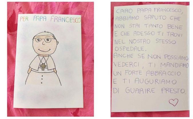 #PopeFrancis. This from a patient in the pediatric oncology ward at Gemelli hospital. "We heard you aren't so well & you're in our hospital now.... We send you a big hug & hope you'll heal quickly." pic.twitter.com/1AeRuNErLY