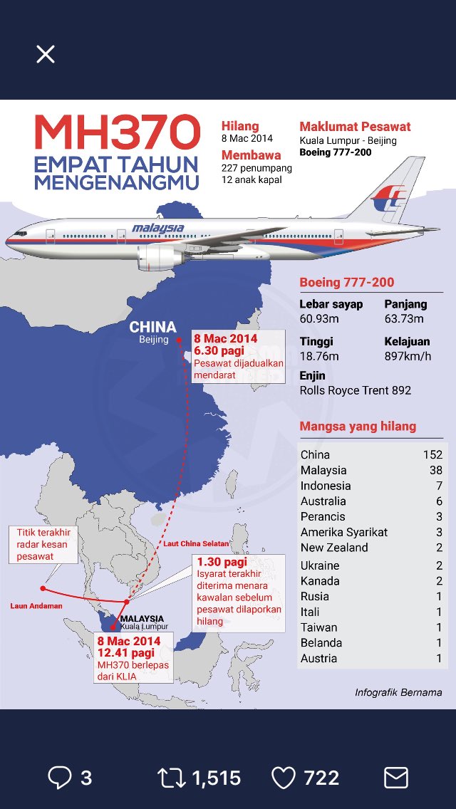 #MalaysianAirlines Flight MH370 from Kuala Lumpur Malaysia to Beijing China went missing with 227 people with 12 crews on board, to this date we still don’t know what happens let’s hope one day will find the aircraft.#MH370#PrayForMH370 pic.twitter.com/1sXTklrlpc