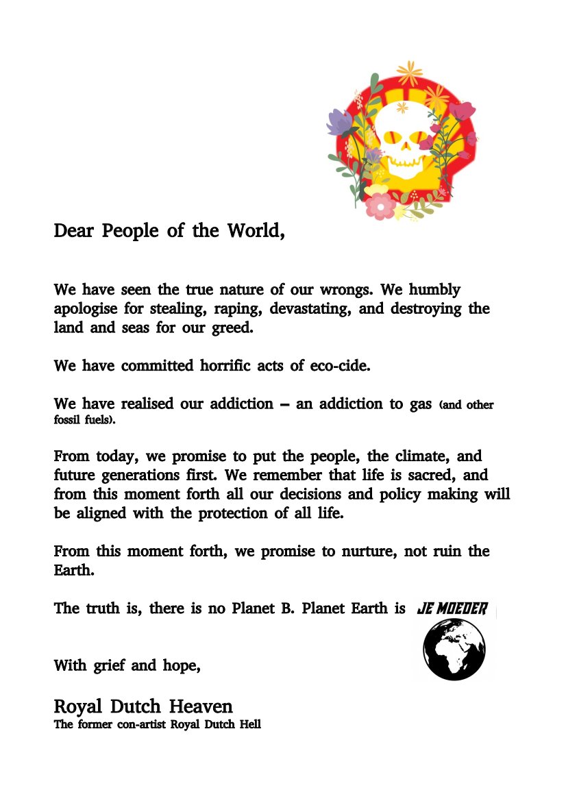 @BBCBreaking NEWS: Former Royal Dutch Hell have made a promise to completely transform their entire infrastructure, policy & gas addictions to serve all life on Earth. They state "Truth is, there is no Planet B. Planet Earth is Je Moeder"#GasdownFrackdown#ReclaimPower pic.twitter.com/q4UQg3xuLN