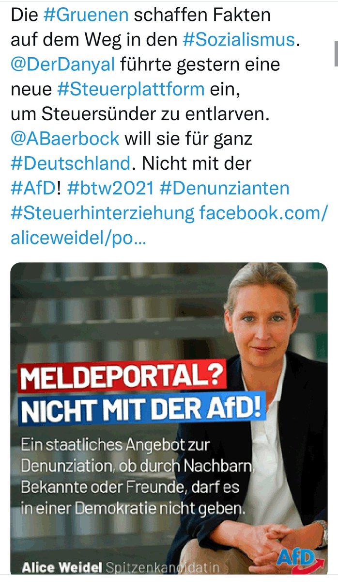 #Gruenen schaffen Fakten auf dem Weg in den#Sozialismus.@DerDanyal führte gestern eine neue#Steuerplattform ein, um Steuersünder zu entlarven.@ABaerbock will sie für ganz#Deutschland. Nicht mit der#AfD!#btw2021#Denunzianten#Steuerhinterziehung https://www.facebook.com/aliceweidel/posts/4673250509352814 …pic.twitter.com/c3PgWJDjn5