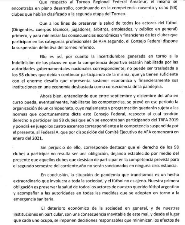 Compartimos la resolución dispuesta por el Consejo Federal de @afa. Se suspende definitivamente el#TRFA y en caso de que las condiciones lo permitan, desde septiembre podría jugarse un nuevo torneo con los equipos que continuaban en competencia.