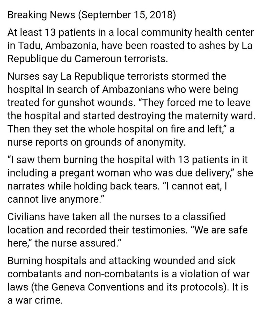 #PaulBiya regime continuously violates#MedicalNeutrality, attacking and destroying medical facilities, ambulances, killing medical professionals and patients in ongoing#GenocideInSouthernCameroons@WHO@RedCross@MSF@UNOCHA@HRC@P4HR@AmnestyWARO@ACHPR@hrw#UNSC#UnGA73pic.twitter.com/sLLK5sgvJj