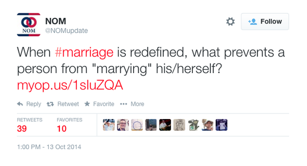 20 Hilarious Responses to NOM's Warning That Gay Marriage Will Lead to People Marrying Themselves http://bit.ly/1yvRknH