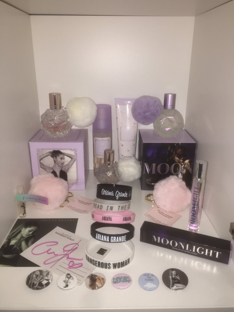 Just reorganized my cabinet with some of my Ariana stuff! Look at how cute it turned out!
