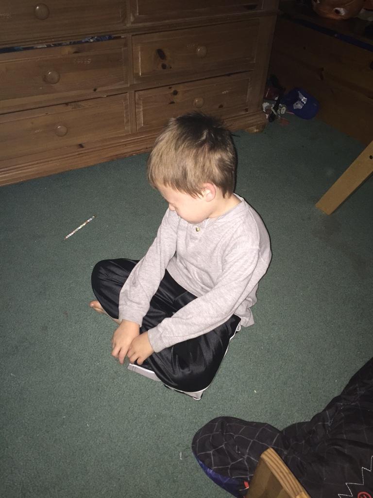 He's sleeping, sitting crossed legged in the dark....