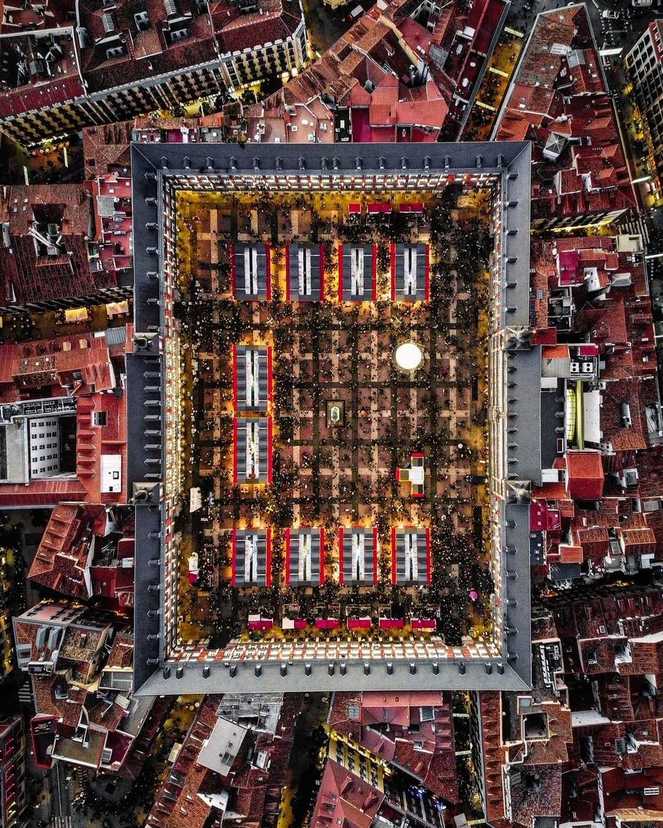 La Plaza Mayor con su emblemático mercado navideño, vista desde el aire