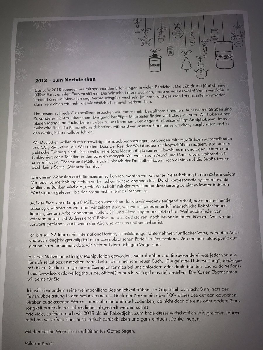 Ich hab von einem Lieferanten einen Brief zu Weihnachten bekommen und bin nur schockiert und sauer. Sieht aus wie ein AFD Plakat. Und ich habe bewusst den Namen nicht verpixelt, wer so einen Schmarn schreibt muss dazu stehen.