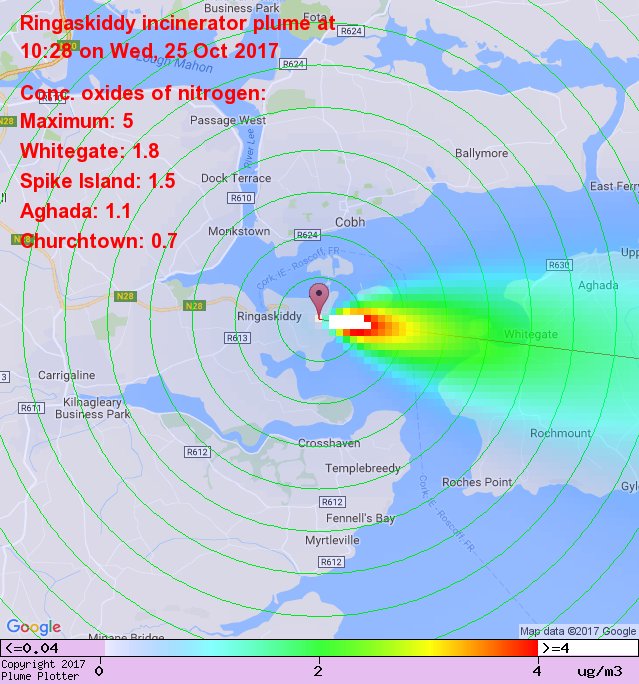 Latest Ringaskiddy incinerator plume plot, 10:28 25/10/17