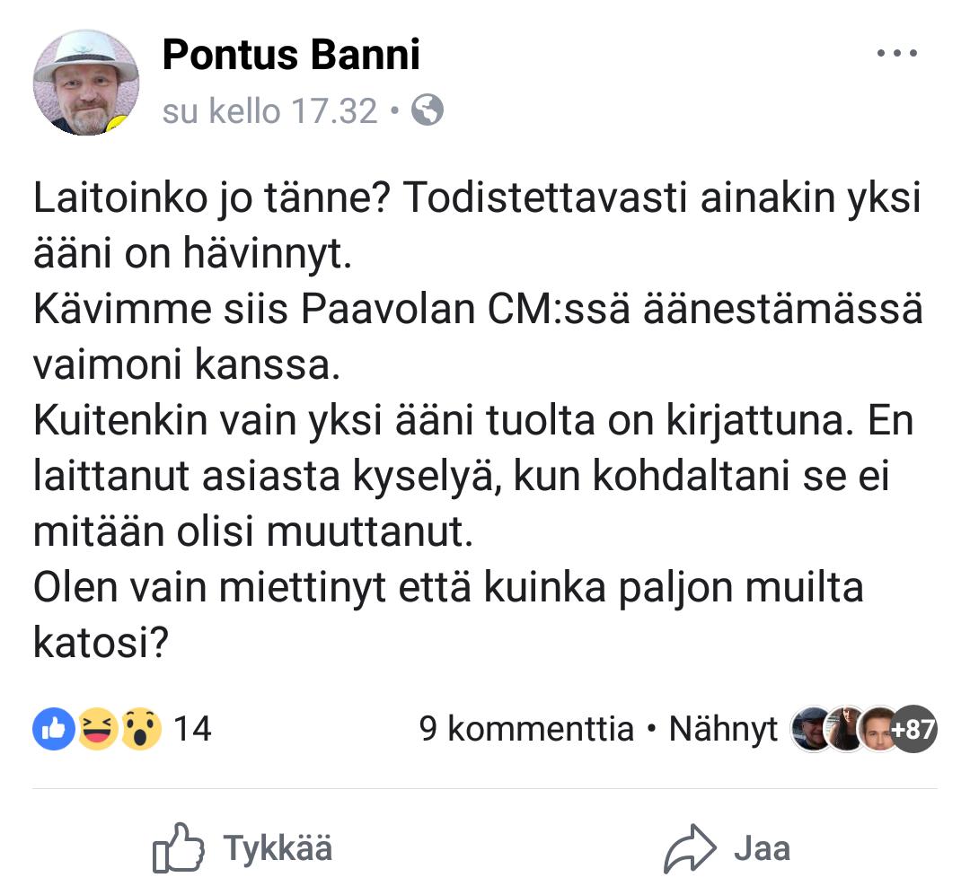 Kuinkahan kauan Pontuksella kestää tajuta, että edes oma vaimo ei äänestänyt.