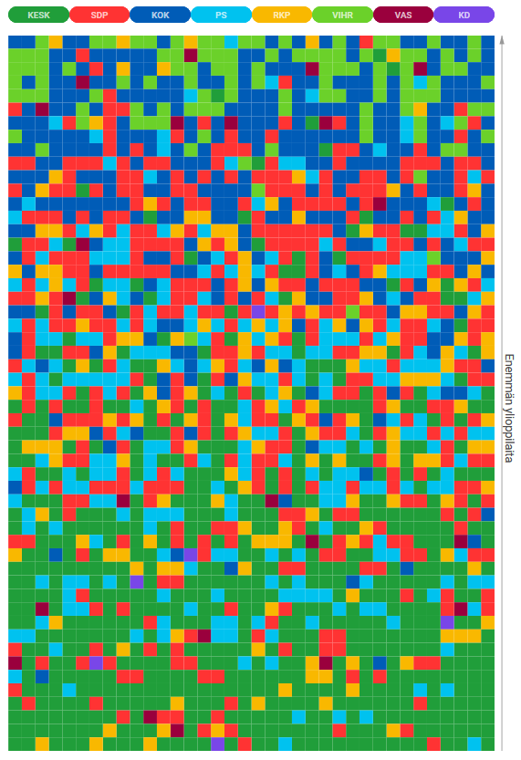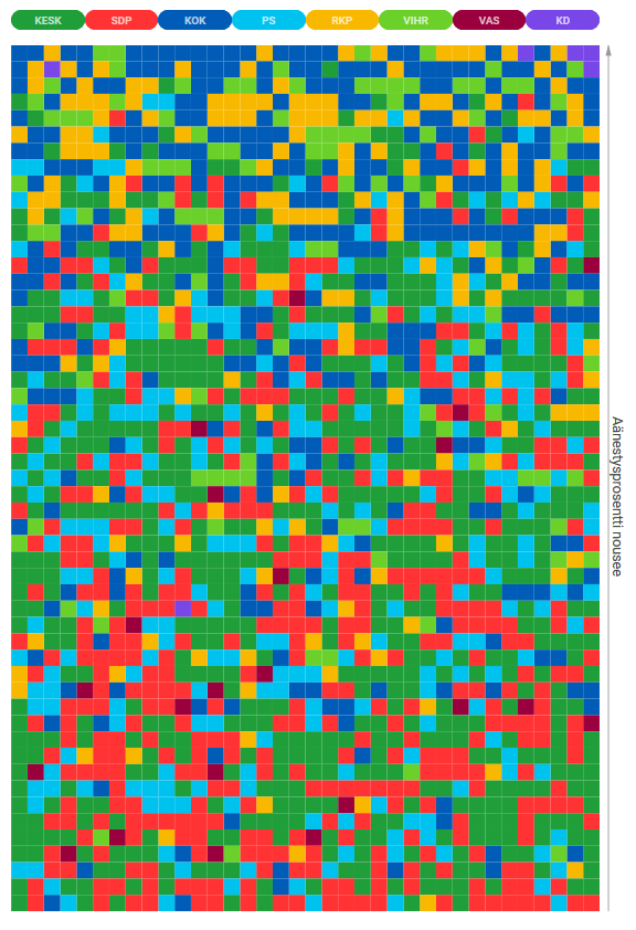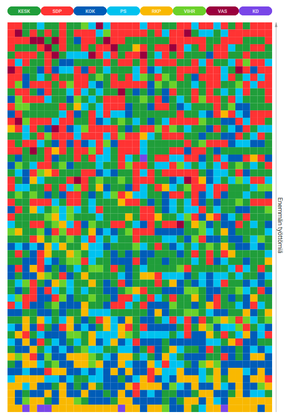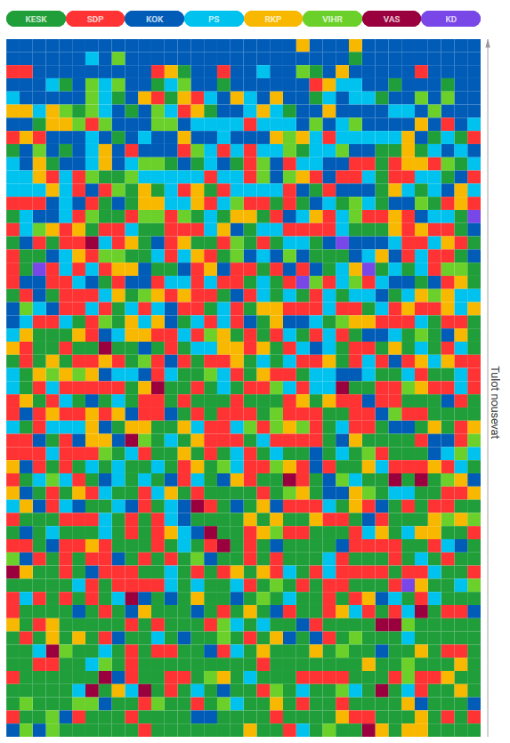 Finland, election result: Coloured by largest party Ordered by 1. Constituencies with higher to lower turnout 2. with higher to lower median income 3. with higher to lower median education 4. with higher to lower unemployment Chart source: Yleisradio