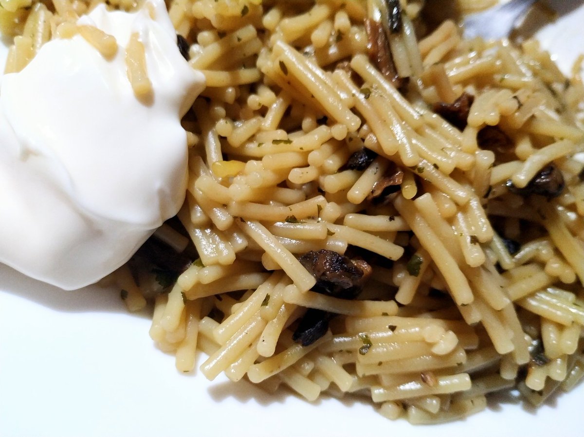 Arroz blanco con sofrito de cebolla, pimiento rojo y champiñones Portobello.