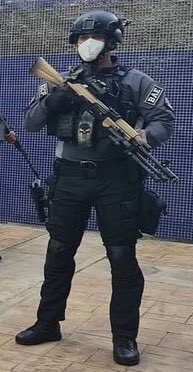 A B.A.E (CICPC) officer with a personal AK-103 with modifications (red dot sight, bipod, flashlight, camouflaged magazine)