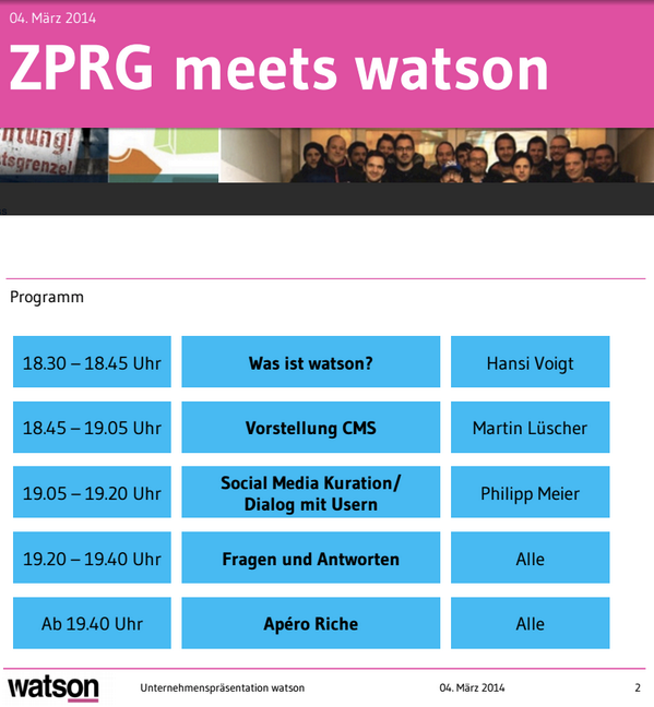 @ZPRG meets watson». Anbei das Programm für alle eingeladenen Gäste.#watsonZPRG pic.twitter.com/X4MuGX6R6I